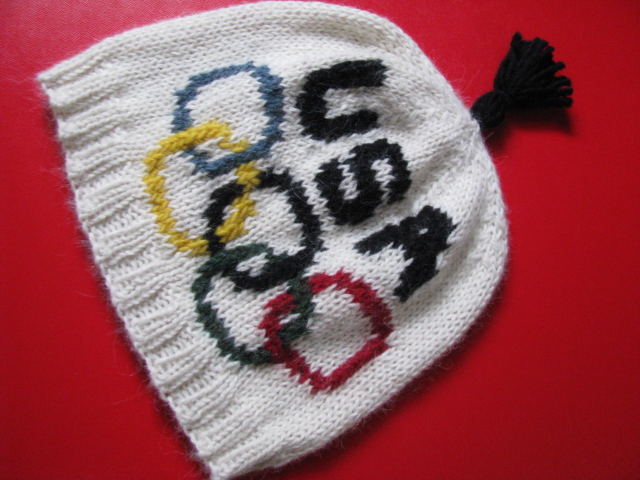 Oh, and I included an Olympic Rings Hat, my own pattern, as the rings are knitted into the hat, not double-stitched after. It’s made with two strands of Jaeger 4 ply alpaca, and similar to the one Lindsey Vonn wore when she won the women’s downhill in the 2010 Olympics, which was a boys’ Ralph Lauren machine made hat.
