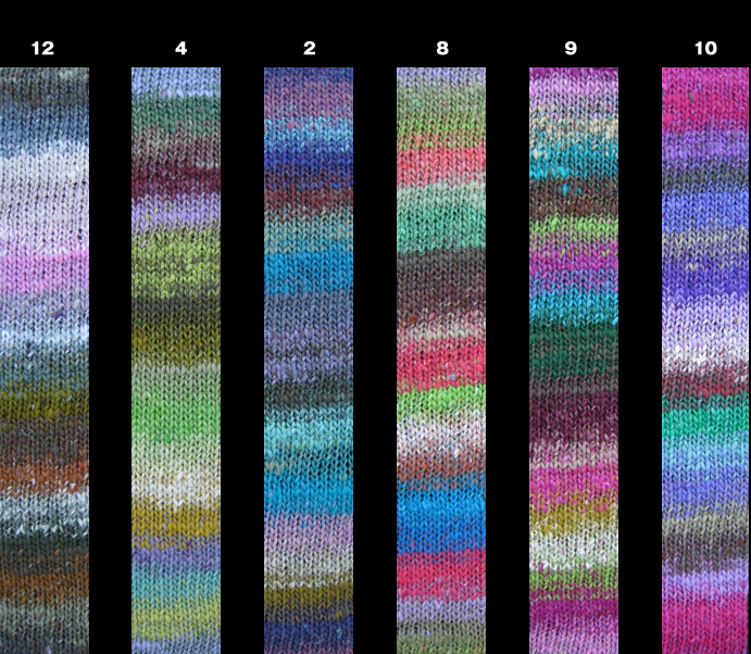 This one is made from Noro Aya, which is self-striping, mostly cotton, has a little silk and wool in it. Very soft wearable yarn. I used No. 2. Know how knitters love to view the different colorways, so I have included them below. It’s a little like eating ice cream!