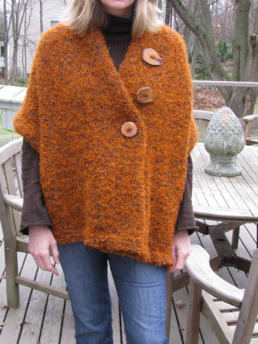 A very easy knitting pattern, great for beginning knitters, just a rectangle you can add your own creativity to. Very versatile in the different looks you can get by buttoning the shawl differently, and a most practical knitting project for spring and fall.
