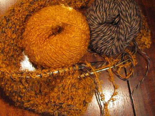 Re: what weight of yarns to use? I used two strands together, which equaled a gauge of 4 sts= 1 inch on a 10.5 US needle. Since gauge doesn’t really matter in this pattern, choose the boucle you like and use with another strand of sport weight yarn. (I used about 620 yds of each yarn.) Knit a swatch, cast on about 20 sts and knit about 4 inches. See if you like the texture of the fabric. If not, then change the needle to suit and adjust the number of stitches per inch.