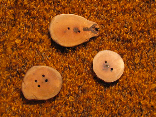 Buttons are placed 4 inches apart and 5 inches from the inside edge, depending on your desired length. There are several sources for handmade wooden buttons on Etsy. Viscount Wood Turning is one. Crochetess is another. Just make sure the buttons are not too heavy for the shawl. The type and style of the buttons will depend on the color of yarn and style you prefer.