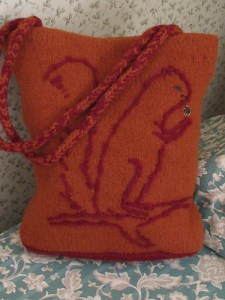 The felted tote bag I told you about recently is finished. You can find the link for a felted bag pattern I made earlier, below. The free knitting pattern works well with KnitPicks 100% wool yarn. Always heave a sigh of relief to get one of these handbags finished, more or less 30-35 hours of work. These handbags are great for carrying all year round, but especially fall, winter, and spring. This one is posted on Etsy now, the “Chicken or the egg felted cross-body tote bag.” Eclectic and one-of-a-kind!