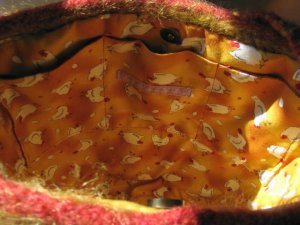 It’s interlined with webbing, then some flannel, and lastly, the chicken and egg Michael Miller fabric. The three inner pockets for cell phone and accessories are lined with a Chinese red silk. I used a giant polished wood rooster button to close it, with extra magnetic snap inside.