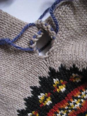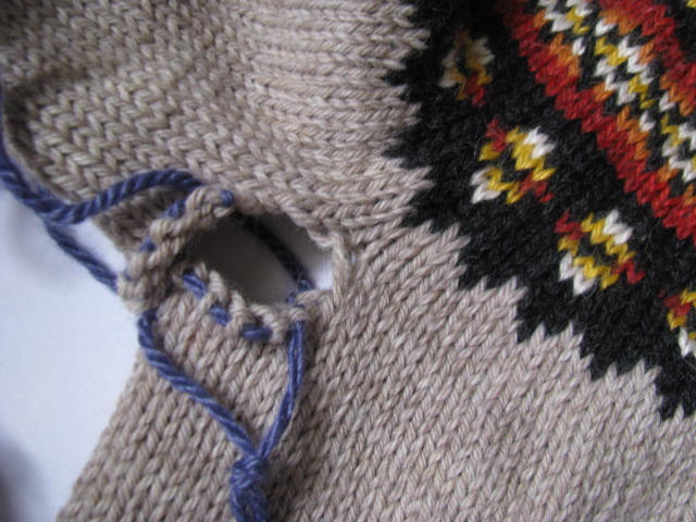 Whipping in the different color yarns of the yoke, inevitably is tiresome, but the underarm can be grafted like closing the toe of a sock or “sewn up” with a three-needle cast off. I’m using the three-needle bind off method, as I think it will be neater for this knitting project. You can also use this method to connect shoulder pieces as well.