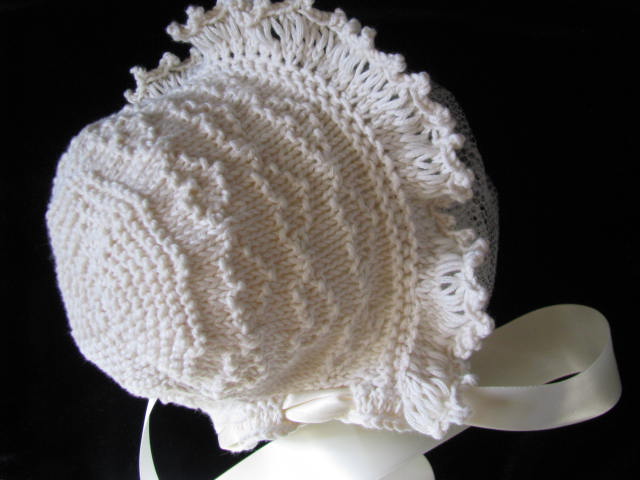 Lace and picot edging make this little bonnet sprinkled with hearts a vintage-style creation that suits any christening or baptismal day, almost any special celebration or just for everyday carriage rides and little girl babies. Written pdf pattern with detailed instruction and photos sent to your specified email address, the baby bonnet knitting pattern accommodates two sizes: newborn to 6 months, and 6 – 12 months. Knit with DK organic cotton yarn. Available on Ravelry as an immediate download, $7.95